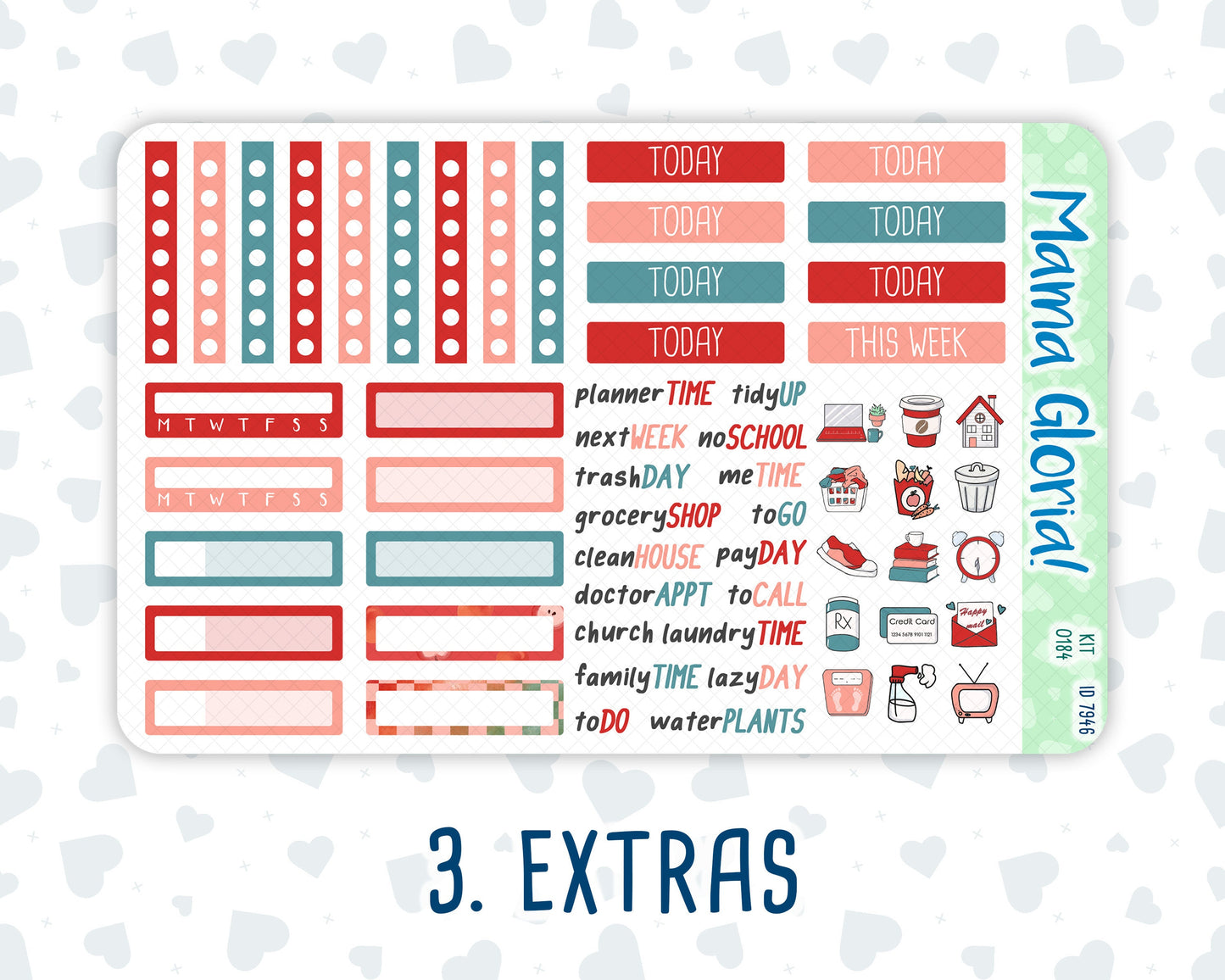 3. Extras – nine checklist strips, two habit trackers, three appt. labels, three basic labels, two pattern labels, “today” and “this week” labels (1.6 inches wide), icons, scripts