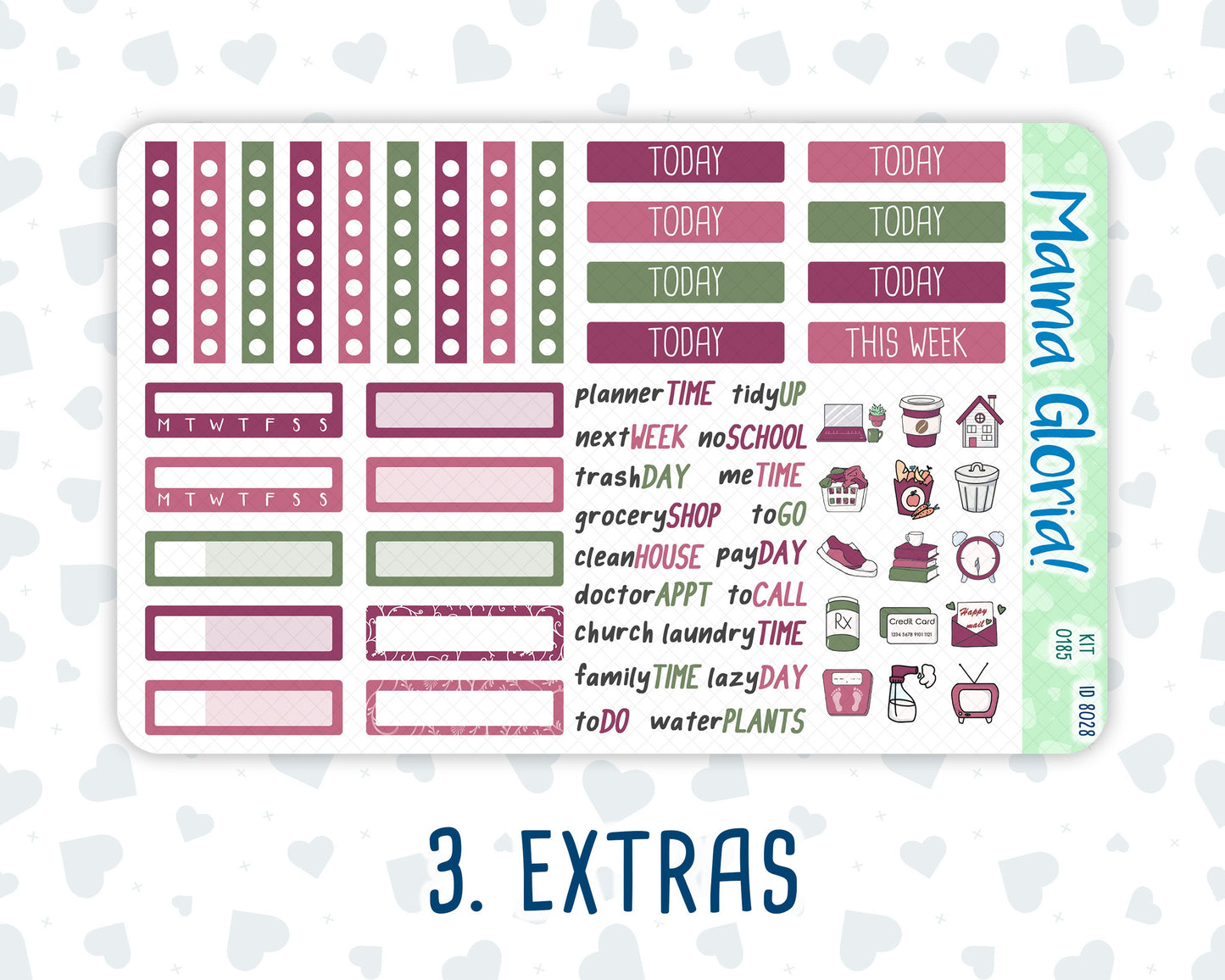 3. Extras – nine checklist strips, two habit trackers, three appt. labels, three basic labels, two pattern labels, “today” and “this week” labels (1.6 inches wide), icons, scripts
