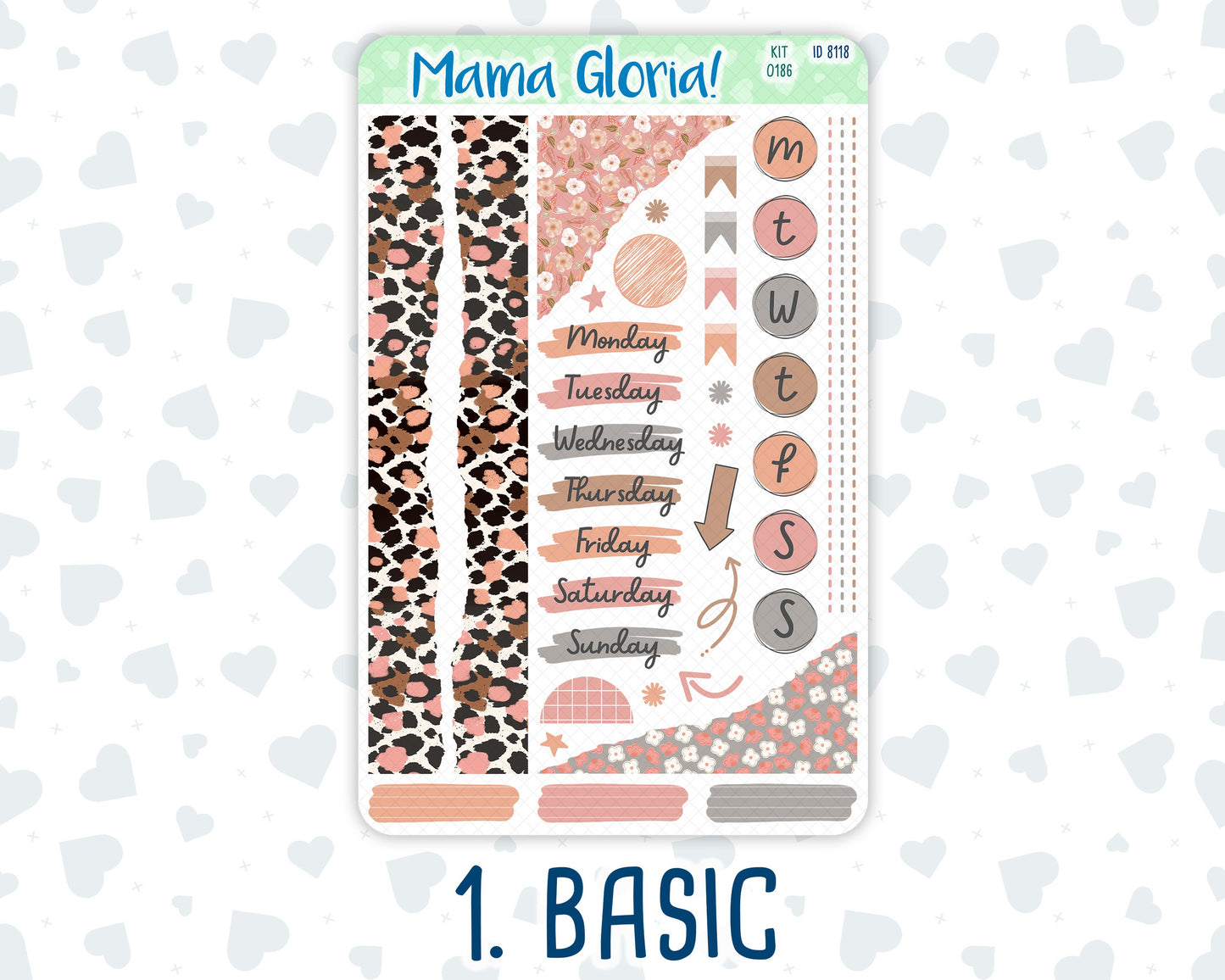 1. Basic – includes circular day-of-the-week stickers, script day-of-the-week stickers, two long washi torn paper strips, bullet points, flags, circle stickers, and stroke labels (1.5 inches wide).