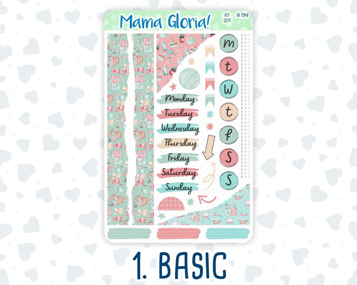 1. Basic – includes circular day-of-the-week stickers, script day-of-the-week stickers, two long washi torn paper strips, bullet points, flags, circle stickers, and stroke labels (1.5 inches wide).