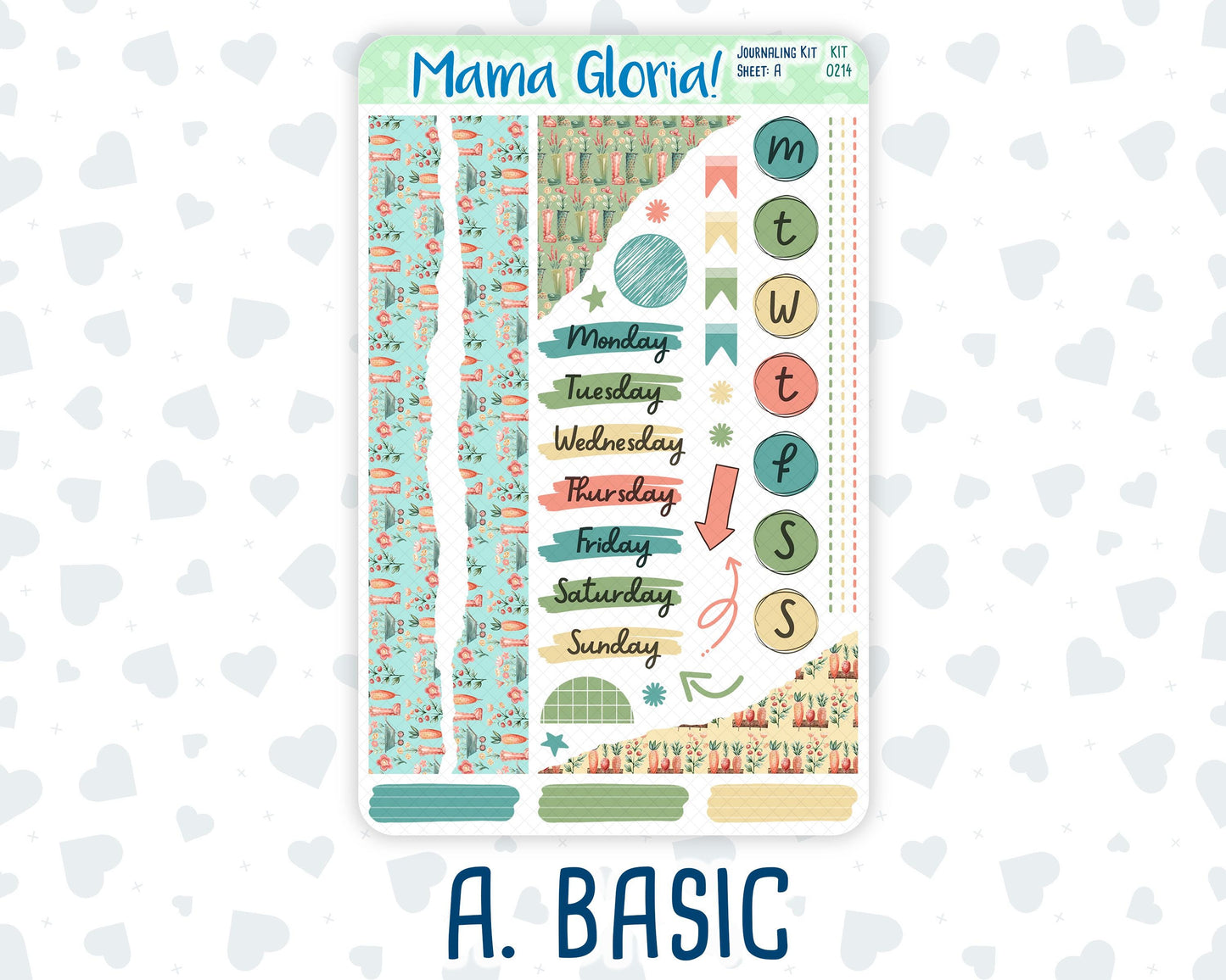 1. Basic – includes circular day-of-the-week stickers, script day-of-the-week stickers, two long washi torn paper strips, bullet points, flags, circle stickers, and stroke labels (1.5 inches wide).