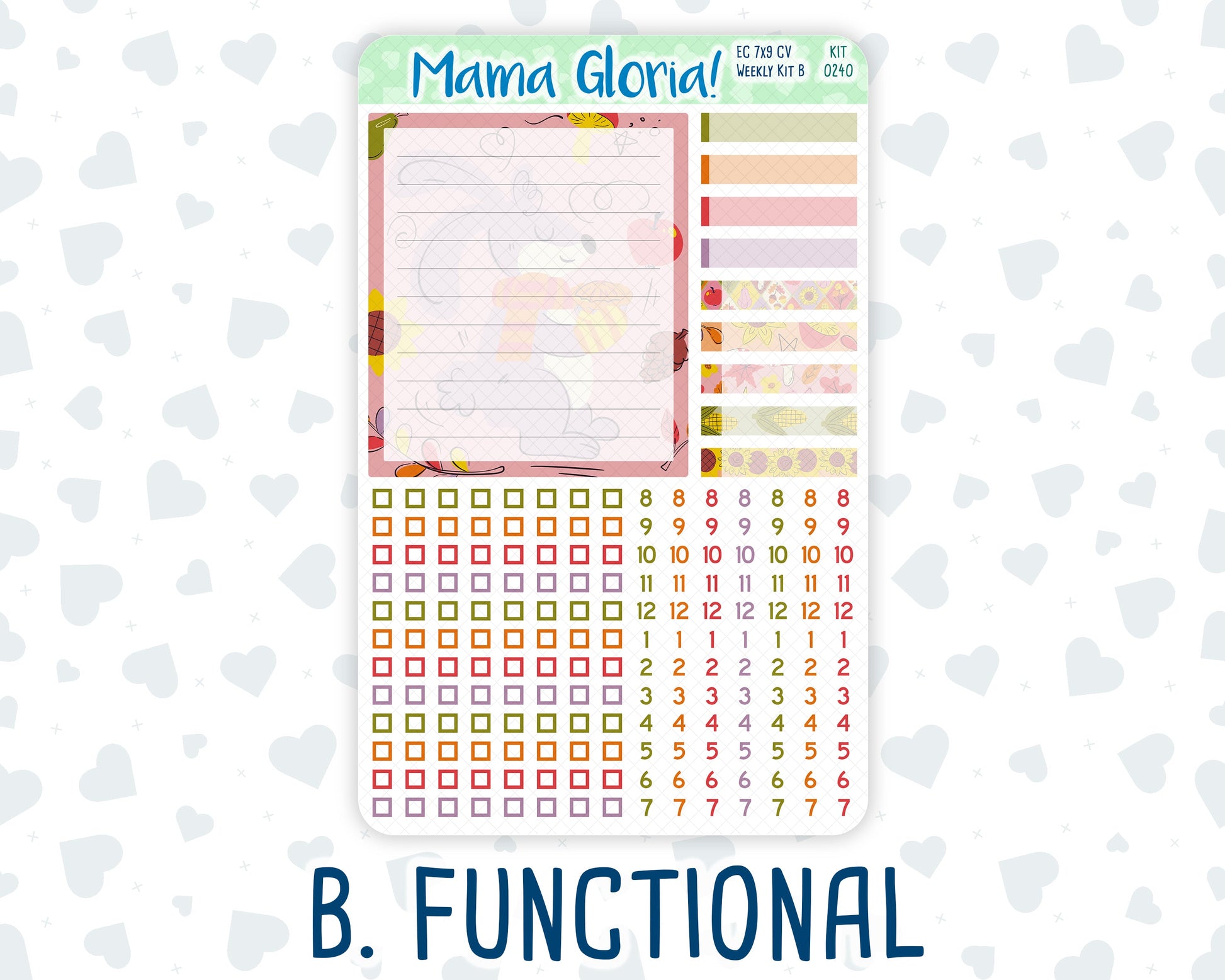 2. Functional Sheet: Lined grid bottom box, checklist, hourly strips, labels.