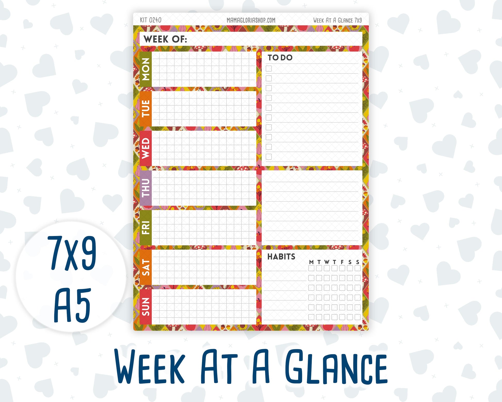 Week at A Glance full page sticker sheet is perfect for notebooks and journals to create your own layout. You can choose from two sizes: 7x9 and A5. It’s ideal to use with a daily planner at the beginning or end of the week for a quick weekly overview.