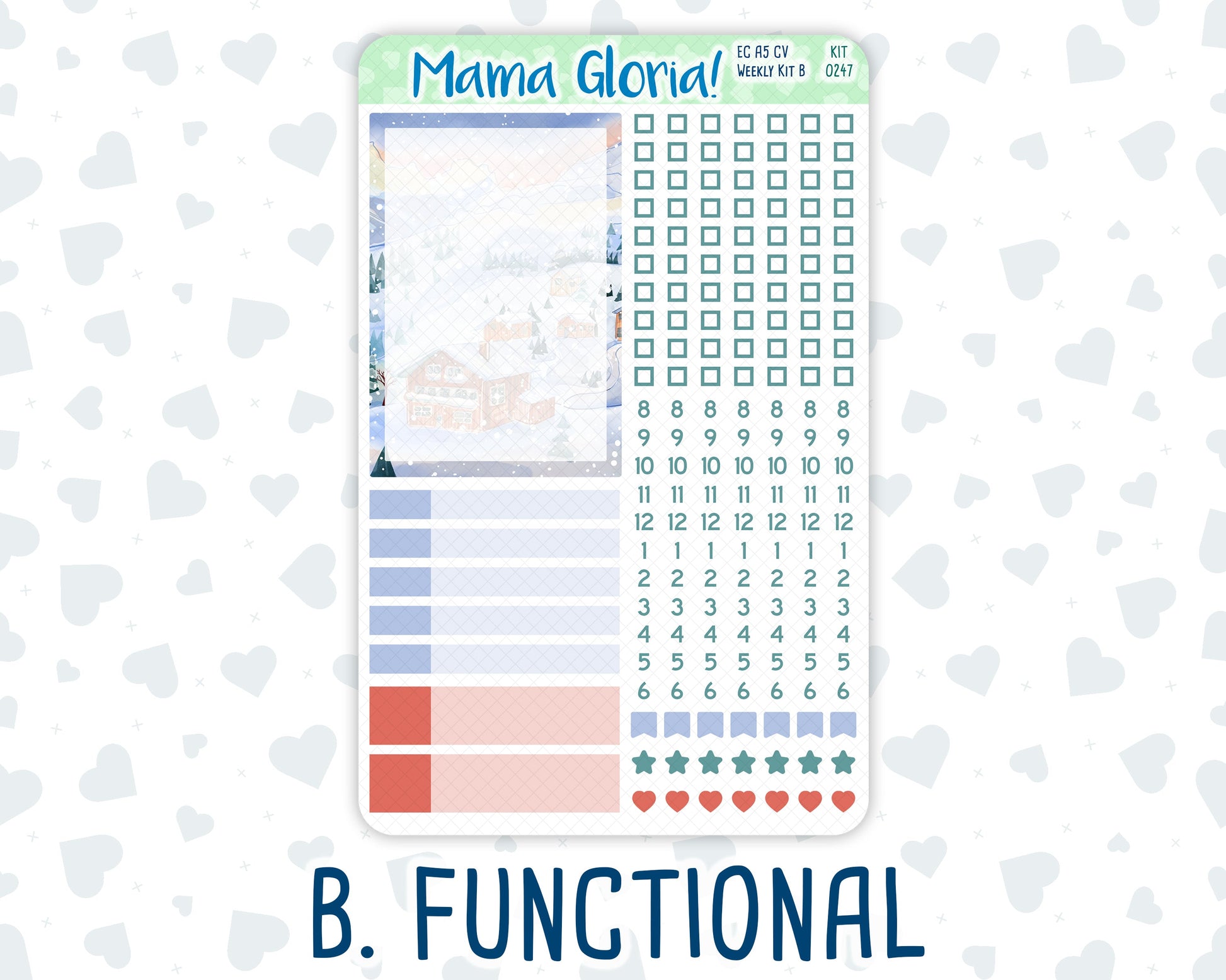 2. Functional Sheet: Bottom full box, checklist, hourly strips, small flags, heart icons, star icons, two-tone labels that take up one and two lines.