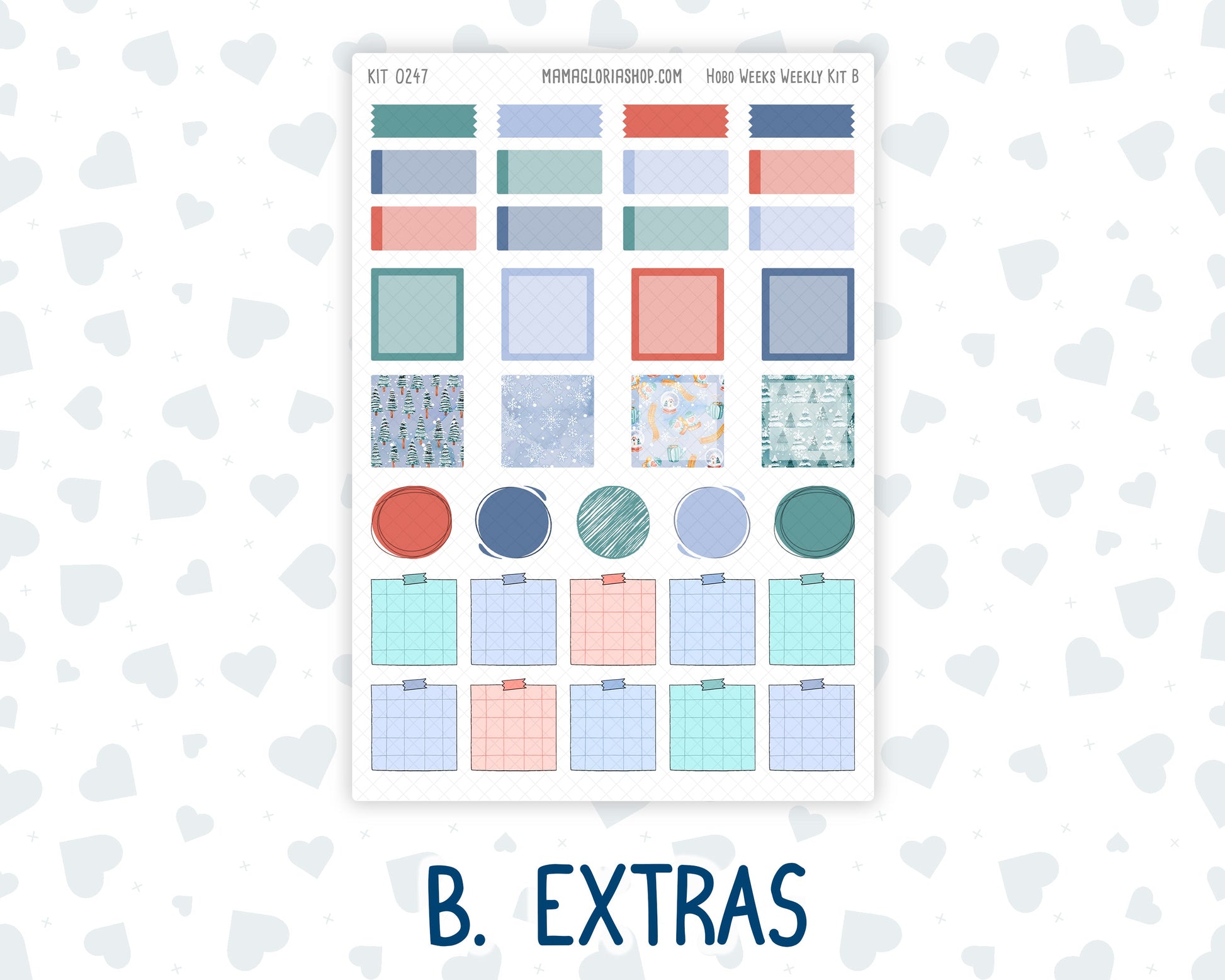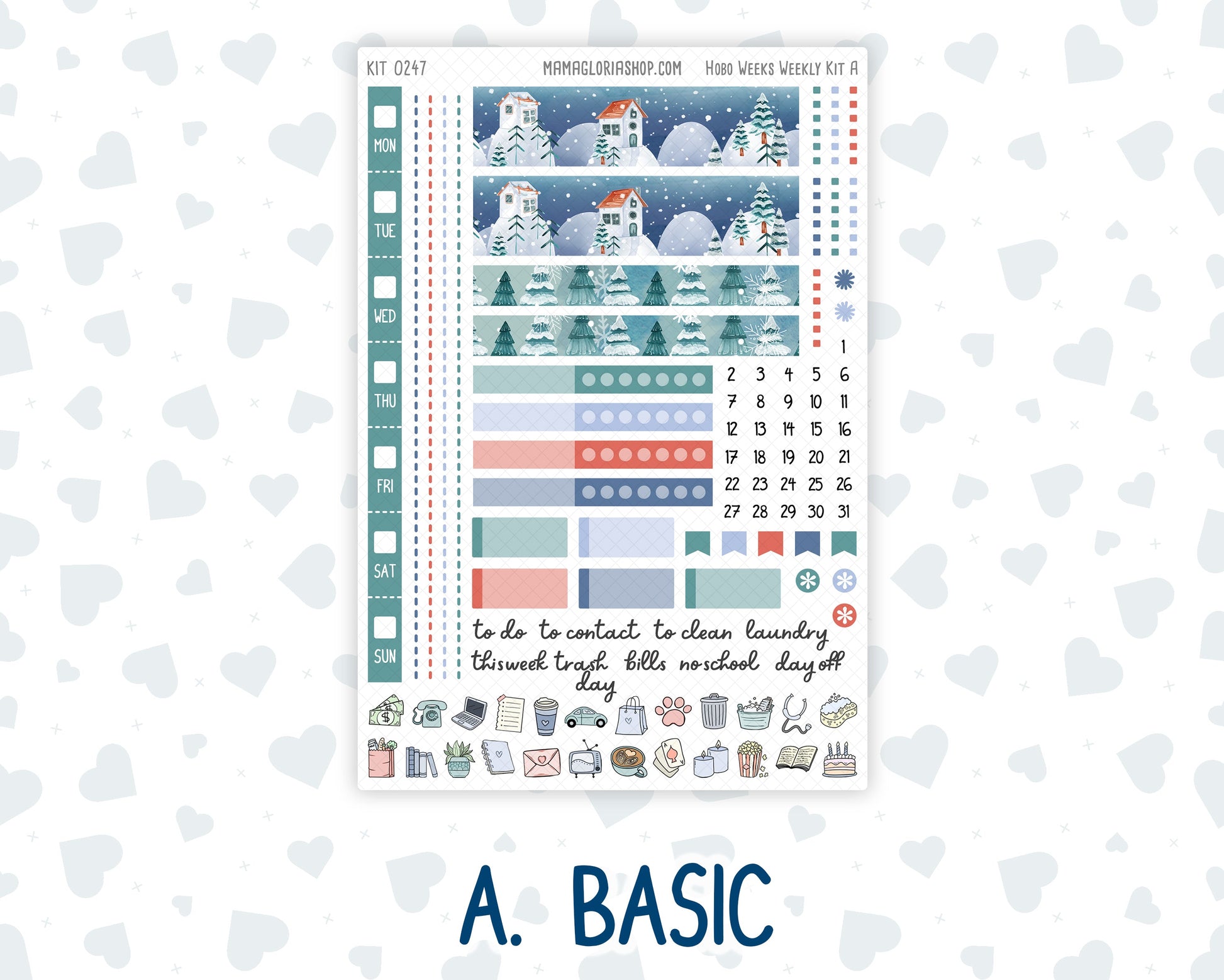 Basic Sheet: - Days of the week strip header - Bottom washi - Top washi - Check box strips - Weekly habit tracker - 24 doodle icons - Dates - Weekly script - Dividers