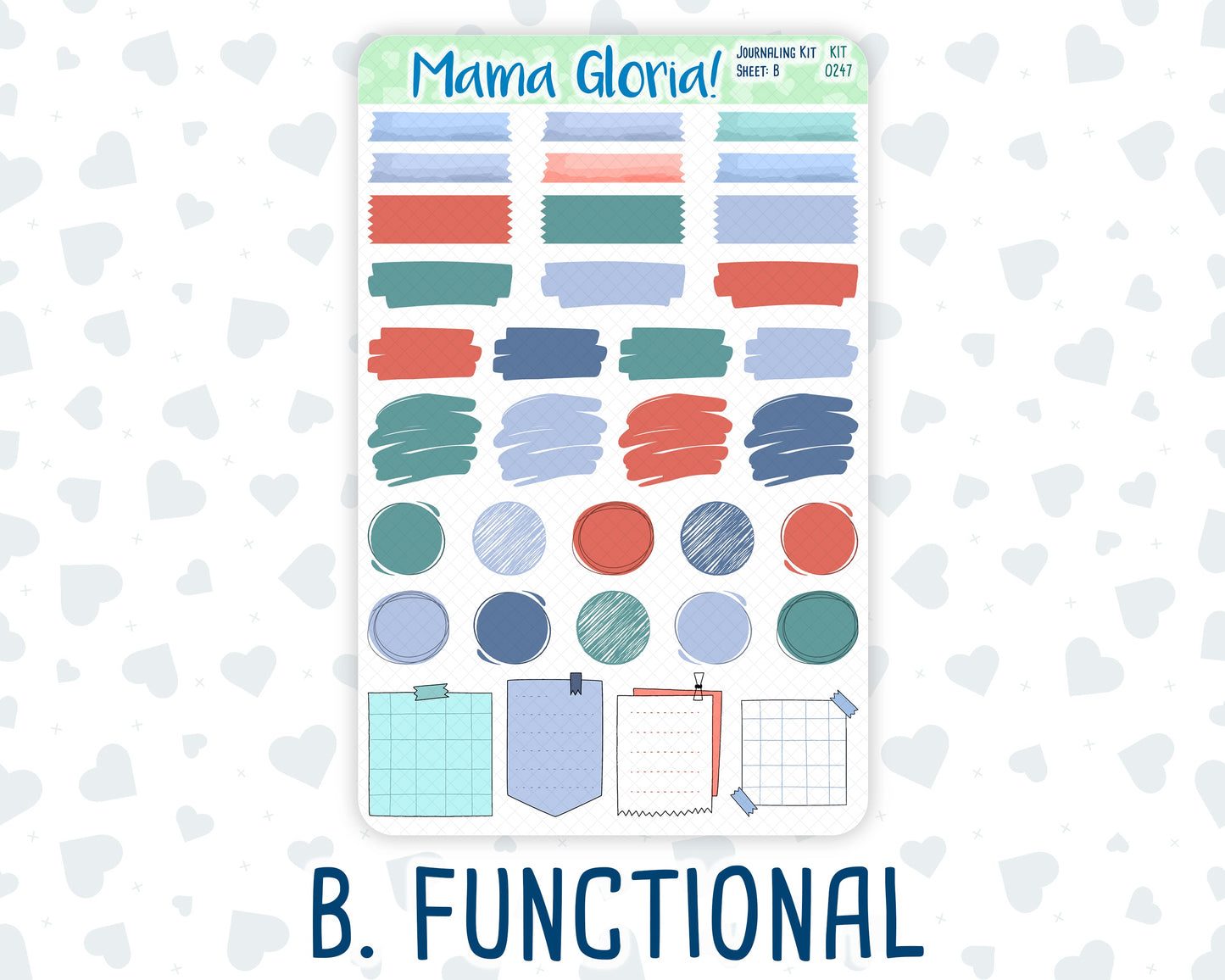 The Journaling Kit consists of four sheets: Basic, Functional, Decorative, and Clipart. This set is suitable for almost any planner, notebook, or journal, regardless of size. It's perfect for those who love planning with a creative touch, offering the ideal blend of creativity and practicality. With this kit, you can create any layout in your planner. It can be used independently or with other kits of the same design. To find other kits in the same design, simply enter the kit number in the store's search bar.