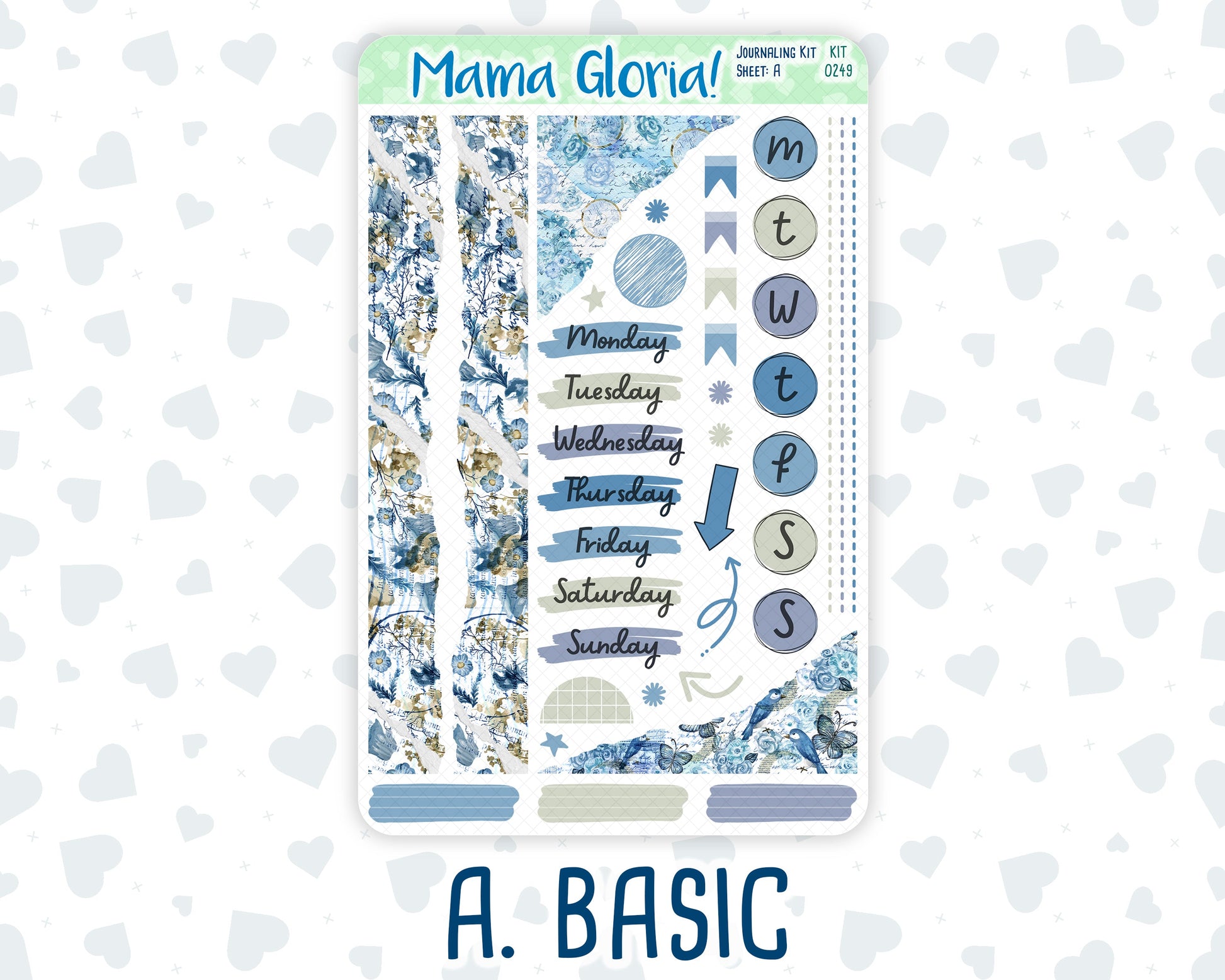 1. Basic – includes circular day-of-the-week stickers, script day-of-the-week stickers, two long washi torn paper strips, bullet points, flags, circle stickers, and stroke labels (1.5 inches wide).
