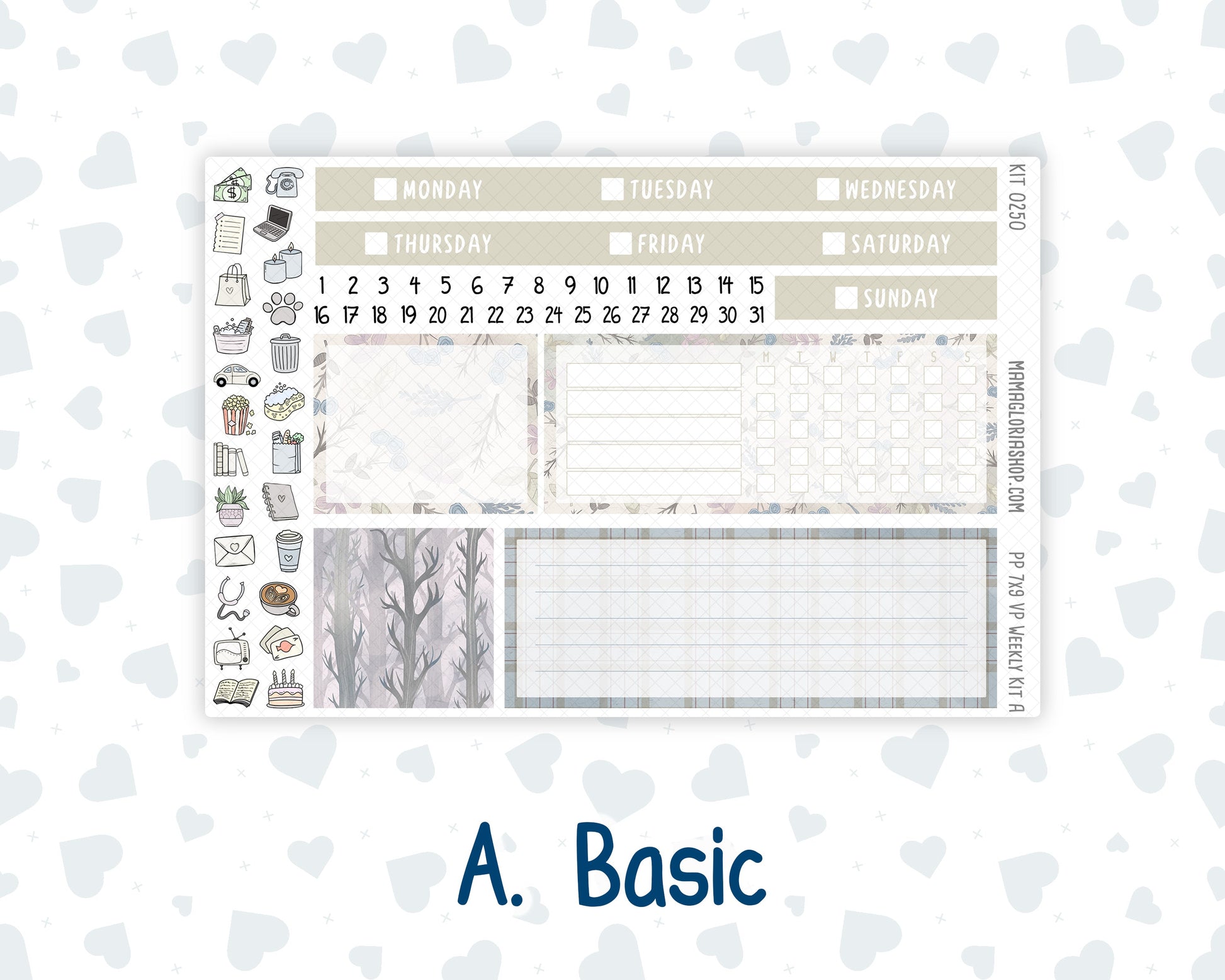 1. Basic: Days of the week strip, icons, habit tracker, patterned notes box, decorative box, dates.