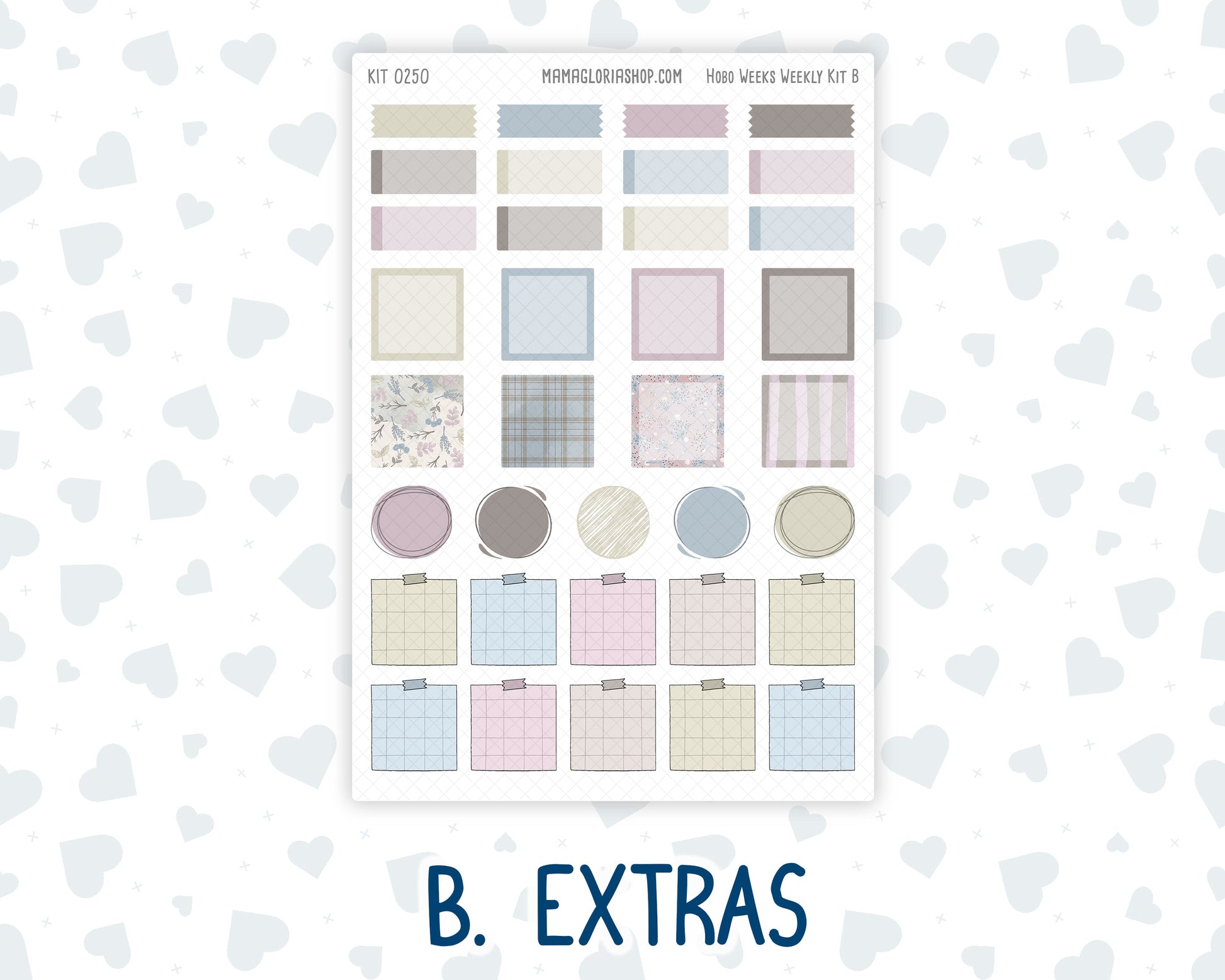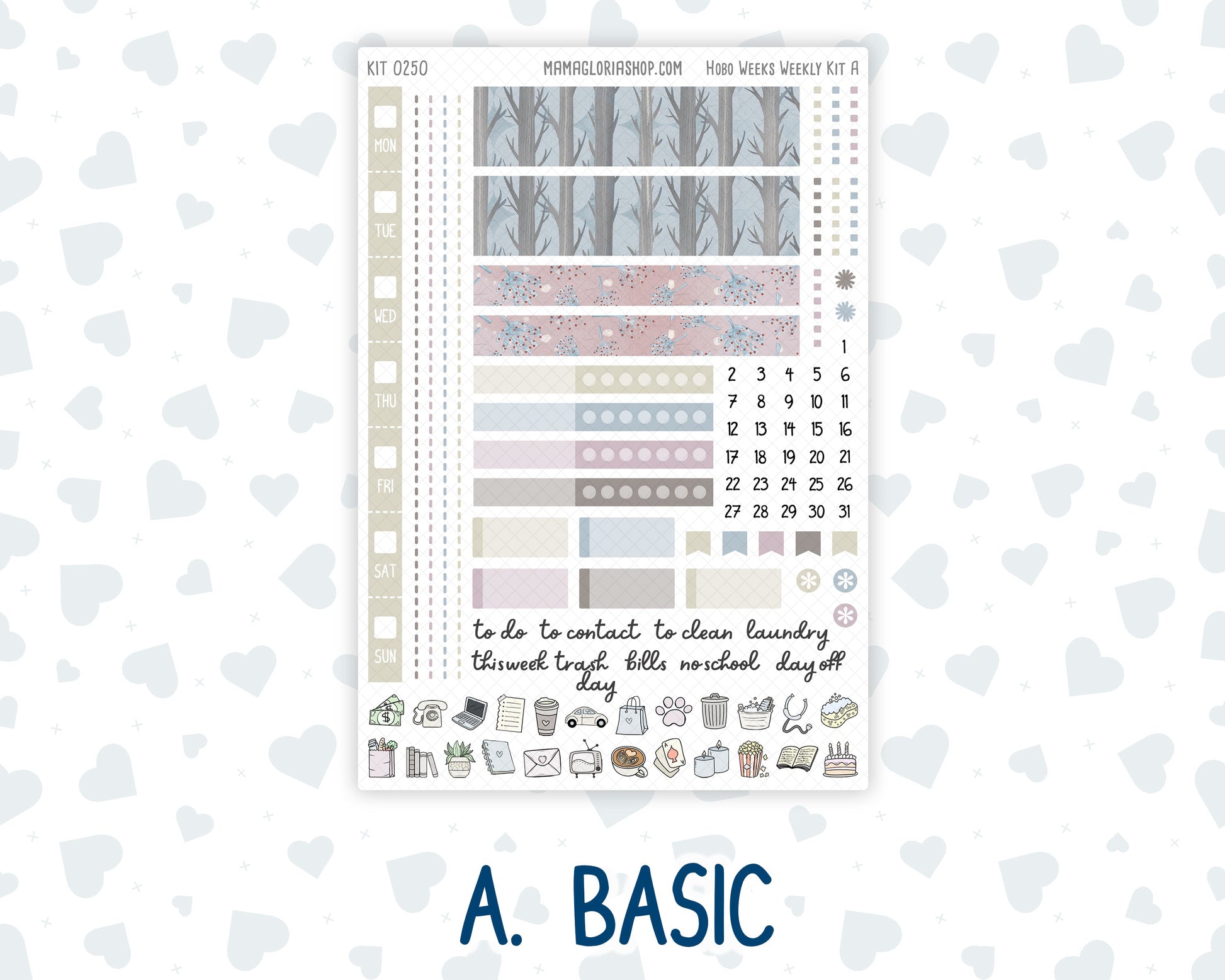 Basic Sheet: - Days of the week strip header - Bottom washi - Top washi - Check box strips - Weekly habit tracker - 24 doodle icons - Dates - Weekly script - Dividers