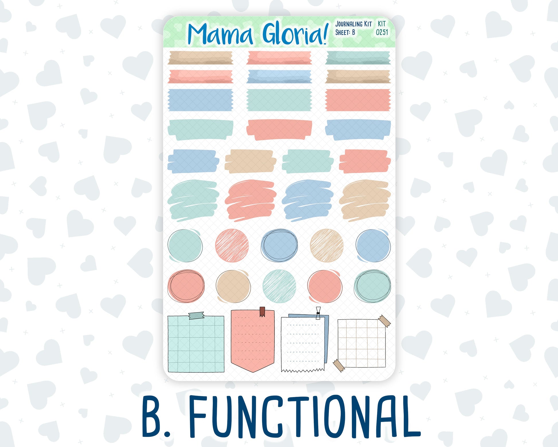 The Journaling Kit consists of four sheets: Basic, Functional, Decorative, and Clipart. This set is suitable for almost any planner, notebook, or journal, regardless of size. It's perfect for those who love planning with a creative touch, offering the ideal blend of creativity and practicality. With this kit, you can create any layout in your planner. It can be used independently or with other kits of the same design. To find other kits in the same design, simply enter the kit number in the store's search bar.